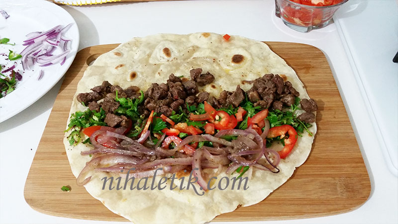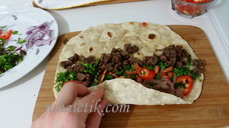 • Yağlanan ve ısınan lavaşınızın üzerine eti, sotelenmiş soğanı, sumaklı maydanozu, doğranmış kapya biber ve domatesi yerleştirip sarın. Sıcak sıcak servis yapın.