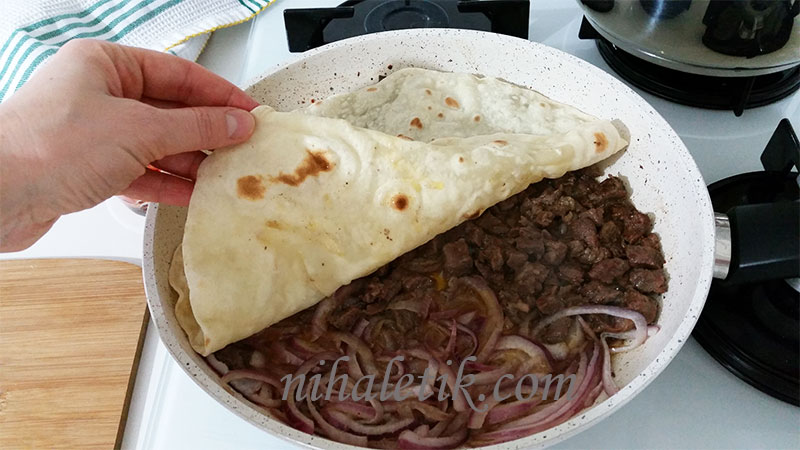 • Etiniz yağ ve baharatlar ile kıvama gelince lavaş ekmeğinizi etin üzerine bastırarak hem ısınmasına hem de etin yağı ile yağlanmasını sağlayın.