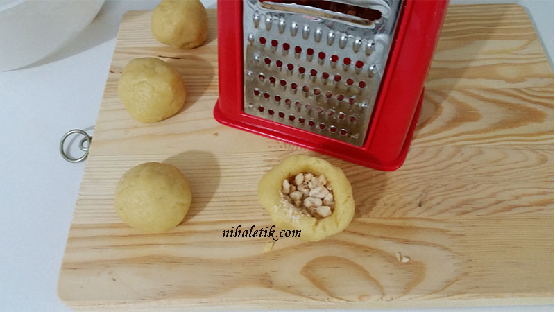 • Cevizden biraz büyük bezeler yapın. Elinizle biraz açıp kevgire bastırın.